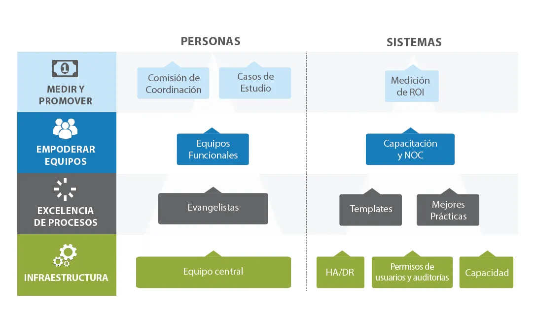 Para que una empresa alcance el punto donde su fuerza de trabajo digital agilice e integre de forma eficiente las operaciones de toda la organización, es necesario establecer una base de conocimiento, mejores prácticas y tecnología de automatización. Esto lleva el nombre de centro de excelencia. Un centro de automatización de excelencia tiene dos enfoques igual de importantes: personas y sistemas.