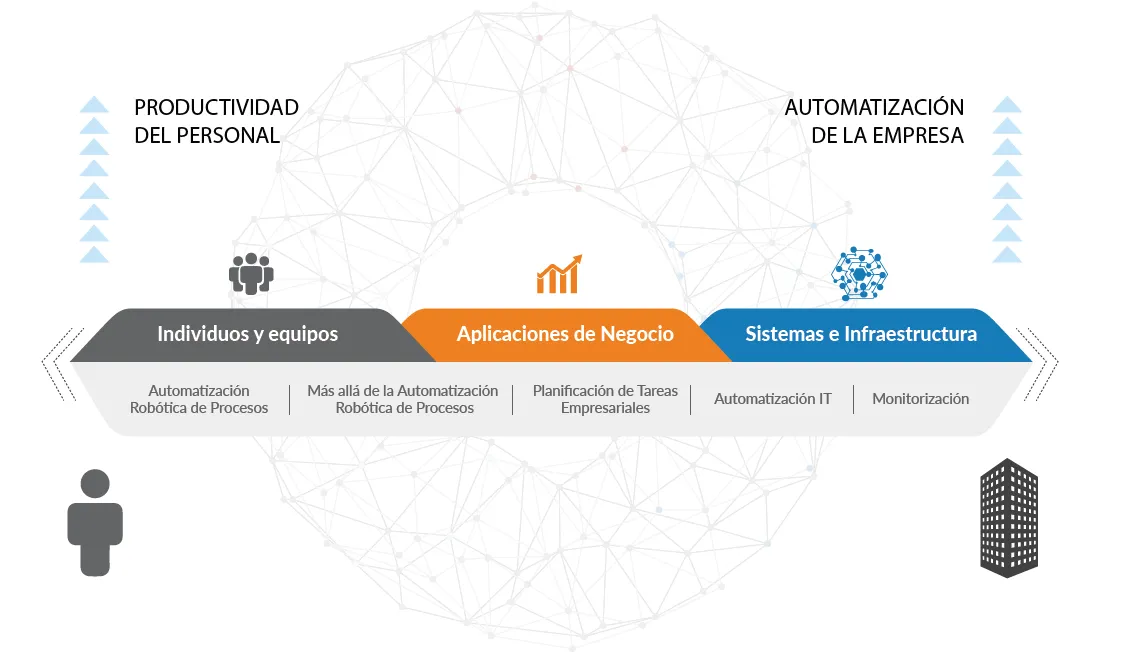 Automatización de IT es un término general que abarca todos los tipos de software de automatización. Este nombre puede crear la idea equivocada de que la automatización de IT se limita a los especialistas en la materia o al departamento de IT. Sin embargo, la automatización de IT moderna cuenta con subgrupos, que incluyen aspectos de RPA, diseñados para ser intuitivos tanto para los usuarios empresariales como para los expertos en tecnología.