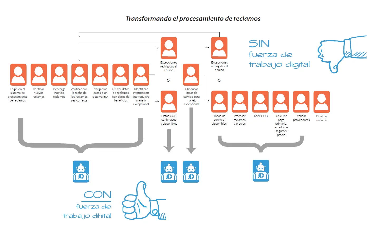 Por ejemplo, los bots pueden gestionar casi todas las etapas del proceso de adjudicación de reclamos: ingresar al sistema de procesamiento de reclamos, descargar y verificar los reclamos, correlacionar los reclamos con la información de los beneficios y calcular los pagos. La fuerza de trabajo humana solo necesita ocuparse de las excepciones que requieren criterio humano.